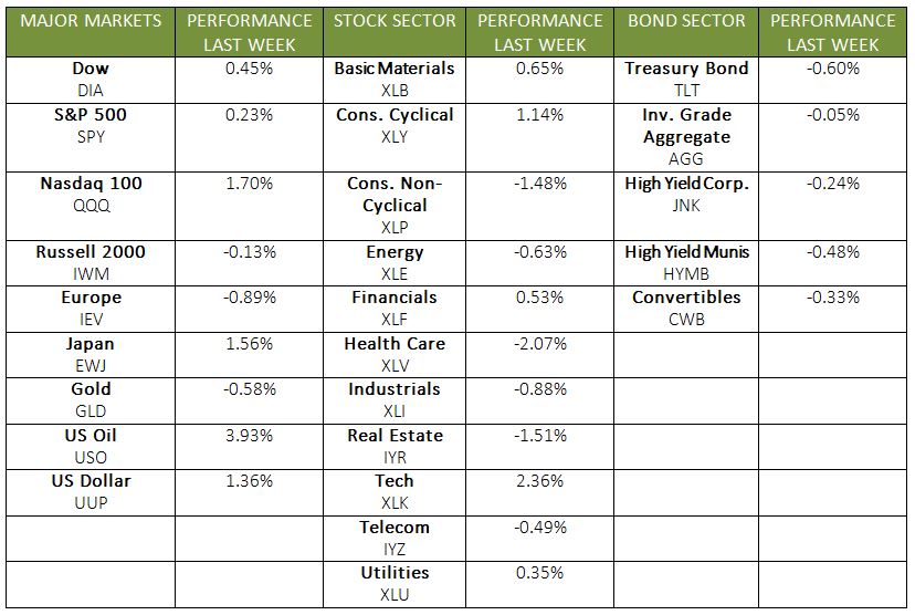 Another week, another round of positive market performance. The 3 major domestic indexes again ended the week with gains and new record highs. The S&P 500 rose 0.23% and marked a 7th-straight week of increases—its longest string of weekly gains in almost 3 years. The Dow added 0.45%, and the NASDAQ grew by 1.09%. Meanwhile, international stocks in the MSCI EAFE slipped slightly, losing 0.35% for the week.