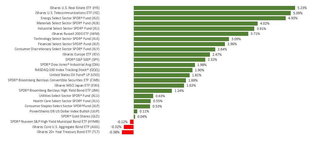 The Dow Jones Industrial Average gained 2.02%, while the Standard & Poor’s 500 rose 2.35%. The Nasdaq Composite index added 2.19%. The MSCI EAFE index, which tracks developed overseas stock markets, increased by 0.76%.