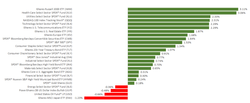 Domestic stocks only traded for 4 days last week, due to the Independence Day holiday. In that time, all 3 major domestic indexes posted positive results for the week. The S&P 500 added 1.52%, the Dow gained 0.76%, and the NASDAQ increased 2.37%. International stocks in the MSCI EAFE were up as well by 0.56%.