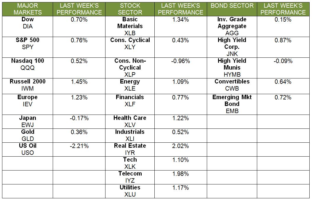 After several weekly losses, the major domestic indexes all ended in positive territory on Friday, August 25. The S&P 500 gained 0.72%, the Dow was up 0.64%, and the NASDAQ added 0.79% for the week. International stocks in the MSCI EAFE also increased by 0.58%.