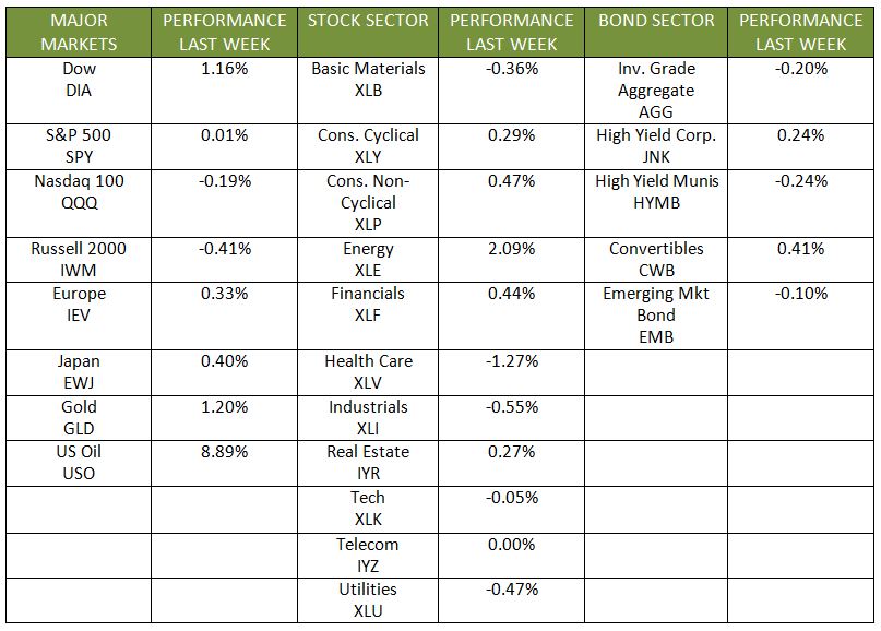 Last week, markets marched ahead within a busy reporting week. The Dow rose 1.16% to close Friday on another new high. The S&P 500 notched a record high during the week, despite closing the week slightly down 0.02%. Meanwhile, the NASDAQ slipped 0.20%, and the MSCI EAFE rose 0.21%.