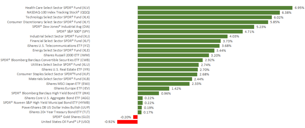 U.S. markets ended a volatile month on a high note Friday. All three major indices posted impressive increases for the week, buoyed by news from the Fed Reserve and international trade. The S&P 500 jumped 4.85%, and the NASDAQ finished up 5.64%—both gains are almost 7-year highs. Meanwhile, the Dow experienced a 2-year high, increasing 5.16%. Internationally, the MSCI EAFE rose 0.95%.