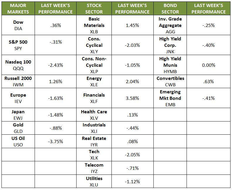 Markets last week were mixed with leading tech stocks falling dramatically as some investors pulled profits. The NASDAQ took the biggest hit, finishing 1.55% down on the week—its worst week of the year. Meanwhile, the Dow rose 0.31% for the week, notching another record close on Friday. The S&P 500 fell 0.30%, and the MSCI EAFE closed the week down 1.22%.
