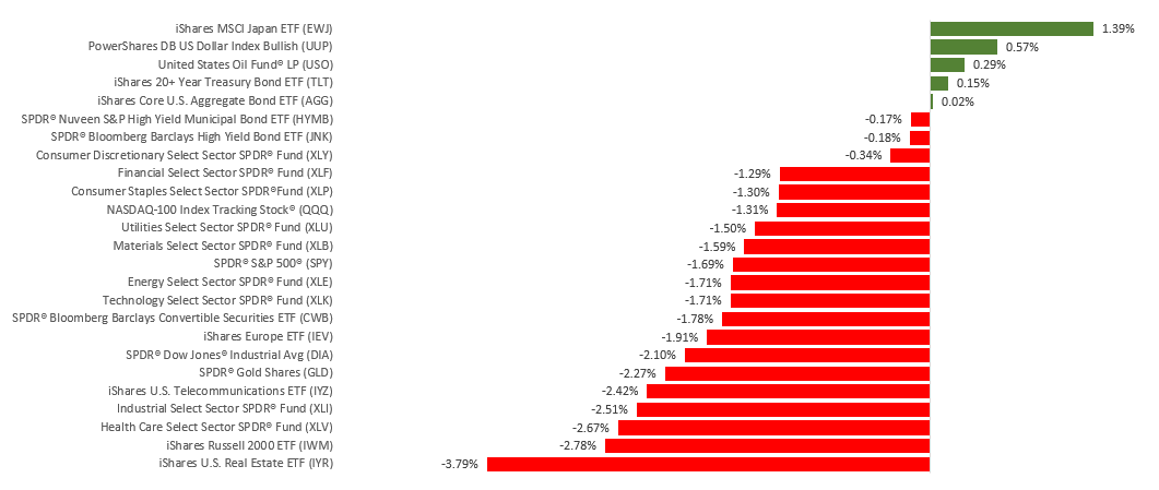 The Dow Jones Industrial Average declined 2.15%, while the Standard & Poor’s 500 dropped 1.69%. The Nasdaq Composite index fell 1.61% for the week. The MSCI EAFE index, which tracks developed overseas stock markets, slipped 0.63%.