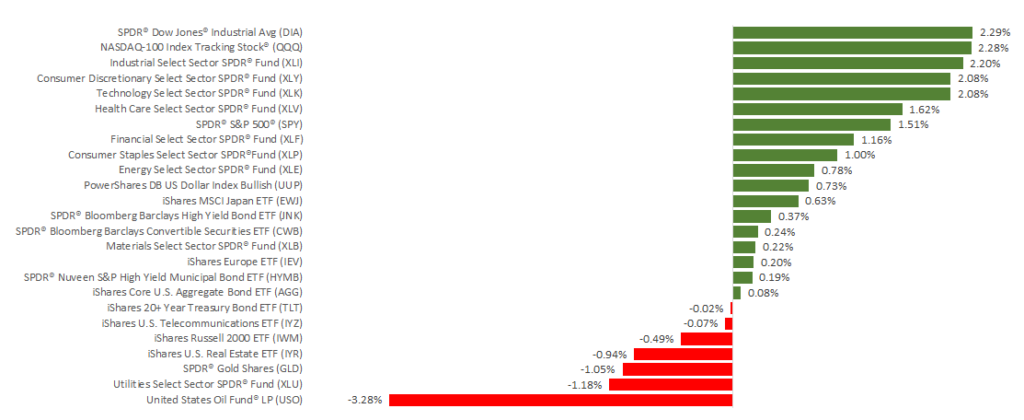 Last week, trade tensions with China lessened somewhat, while the 2nd quarter corporate earnings season started with mixed results. Against this backdrop, domestic stocks experienced sizable growth. By market’s close on Friday, July 13, the S&P 500 was above 2,800 for the first time since February 1. Meanwhile, the Dow was above 25,000, and the NASDAQ had hit a new record. For the week, the S&P 500 gained 1.50%, the Dow added 2.30%, and the NASDAQ was up 1.79%. International stocks in the MSCI EAFE increased as well by 0.16%.