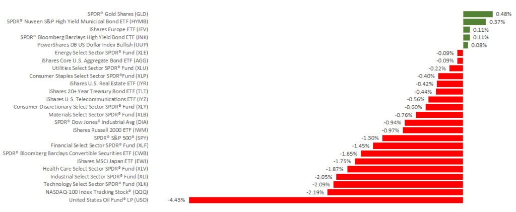 Domestic stocks lost ground last week as trade war concerns continued to rattle investors. With these declines, the Dow officially moved back into correction territory. For the week, the S&P 500 lost 1.43%, the Dow dipped 0.95%, and the NASDAQ dropped 2.11%. International stocks in the MSCI EAFE managed a 0.38% increase.