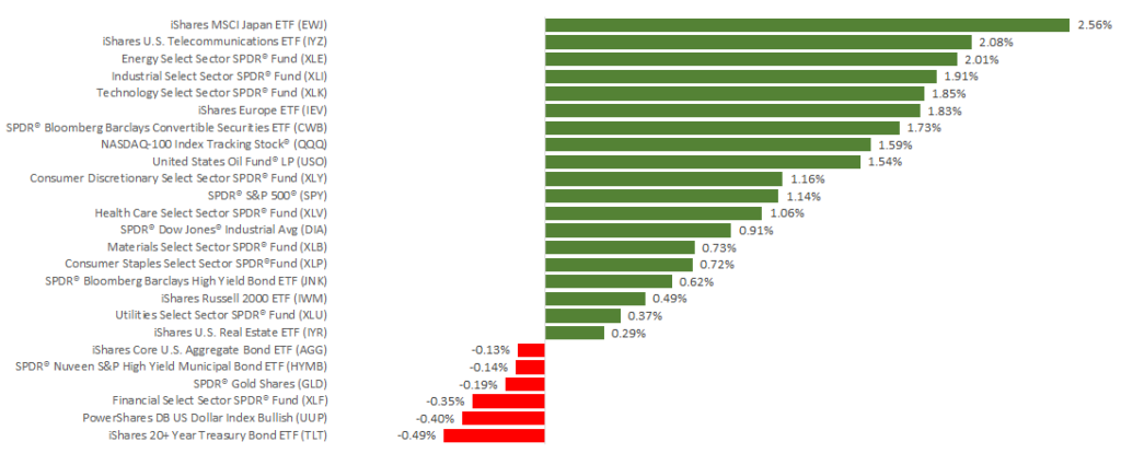 Let’s examine last week’s data to understand examples of where we are today: Domestic indexes rebounded to post healthy gains for the week, with the S&P 500 adding 1.16%, the Dow gaining 0.92%, and the NASDAQ increasing 1.36%. International stocks in the MSCI EAFE were also up, gaining 1.76%.