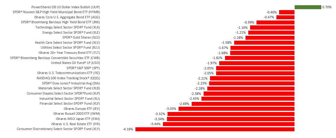 The Dow Jones Industrial Average lost 2.21%, while the Standard & Poor’s 500 retreated 2.11%. The Nasdaq Composite index backtracked 2.59% for the week. The MSCI EAFE index, which tracks developed overseas stock markets, slumped 2.83%.