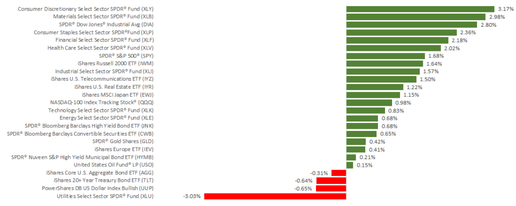 As last week ended, tension between the U.S. and some of its greatest allies was on the rise. Trade remained a hot-button topic ahead of the G-7 meeting in Canada, but investors seemed largely unfazed by the drama. In fact, all 3 domestic indexes posted strong results: The S&P 500 added 1.62% and the NASDAQ gained 1.21%, with both indexes notching their 3rd week of gains in a row. The Dow ended Friday up 2.77% for the week—recording both its highest level and largest weekly gain since March. International stocks were also up, with the MSCI EAFE increasing by 0.91%.