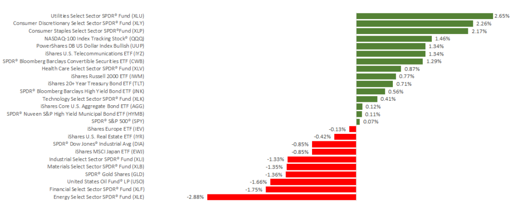 Last week stocks showed mixed results as political headlines continued to dominate the news. The Dow lost 0.89% and the S&P 500 was almost flat with a 0.02% gain. The NASDAQ, on the other hand, reached a record high on Thursday and ended the week up 1.32%. Both the S&P 500 and NASDAQ experienced their 4th week of gains in a row. International stocks in the MSCI EAFE lost ground, posting a 0.52% decline.