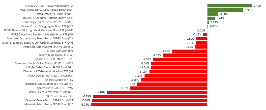 The Dow Jones Industrial Average dropped 3.45% while the Standard & Poor’s 500 lost 1.91%. The Nasdaq Composite index slipped 0.28% for the week. The MSCI EAFE index, which tracks developed overseas stock markets, fell 0.64%.