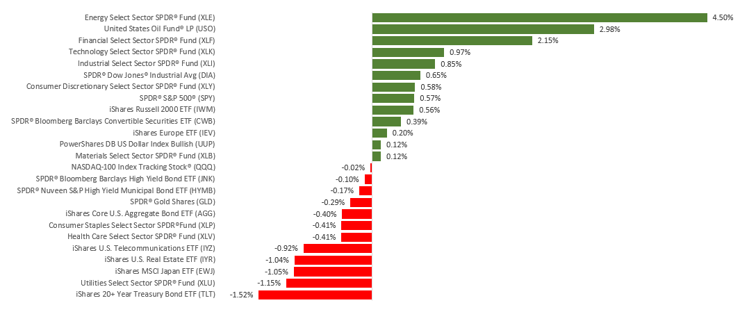 The Dow Jones Industrial Average gained 0.62%, while the Standard & Poor’s 500 advanced 0.51%. The Nasdaq Composite index was flat (+0.02%) for the week. The MSCI EAFE index, which tracks developed overseas stock markets, ticked higher by 0.20%.